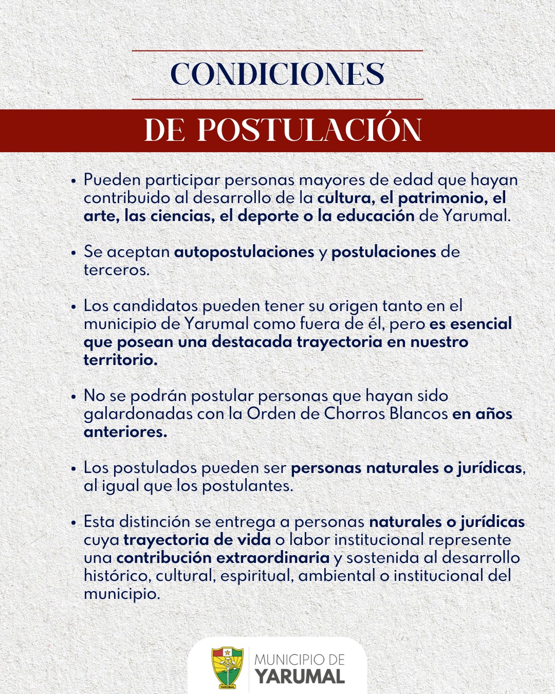 La distinción busca visibilizar acciones ejemplares, iniciativas comunitarias y trayectorias de servicio que fortalecen el tejido social y promueven el orgullo por el territorio. La ciudadanía podrá postular a aquellas personas que consideren han marcado una diferencia positiva y cuyo compromiso refleje los valores que Nos Unen como comunidad.