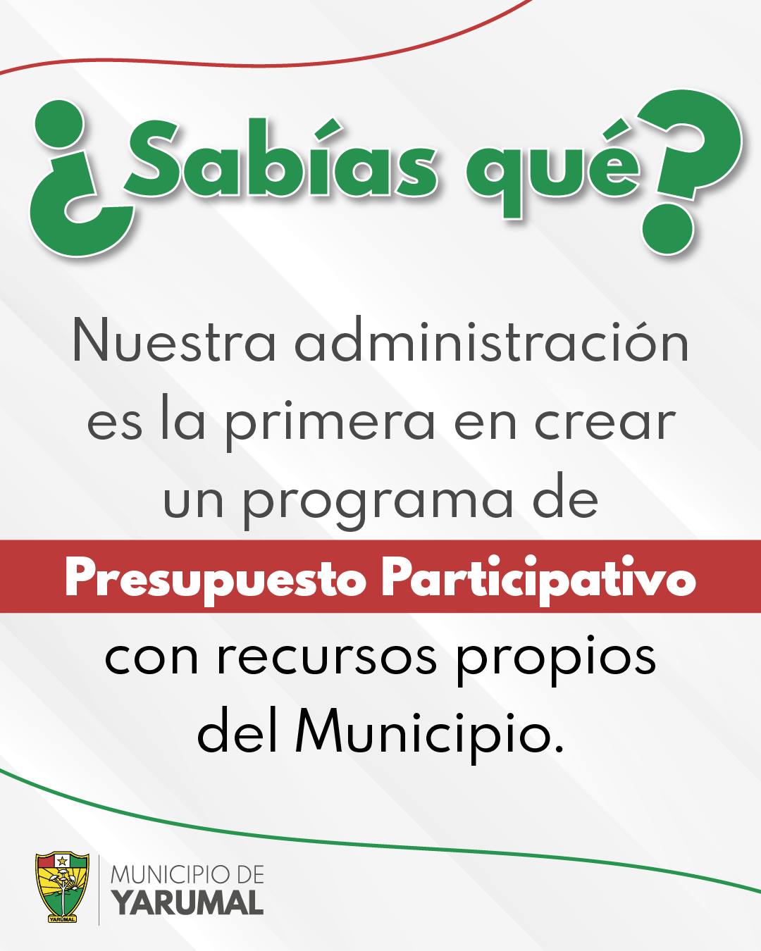 Nuestra administración es la primera en la historia de Yarumal en crear un programa de Presupuesto Participativo financiado con recursos propios del Municipio ❤🤍💚. Esta apuesta no solo marca un precedente, sino que reafirma nuestro compromiso con una gestión democrática, transparente y transformadora.
