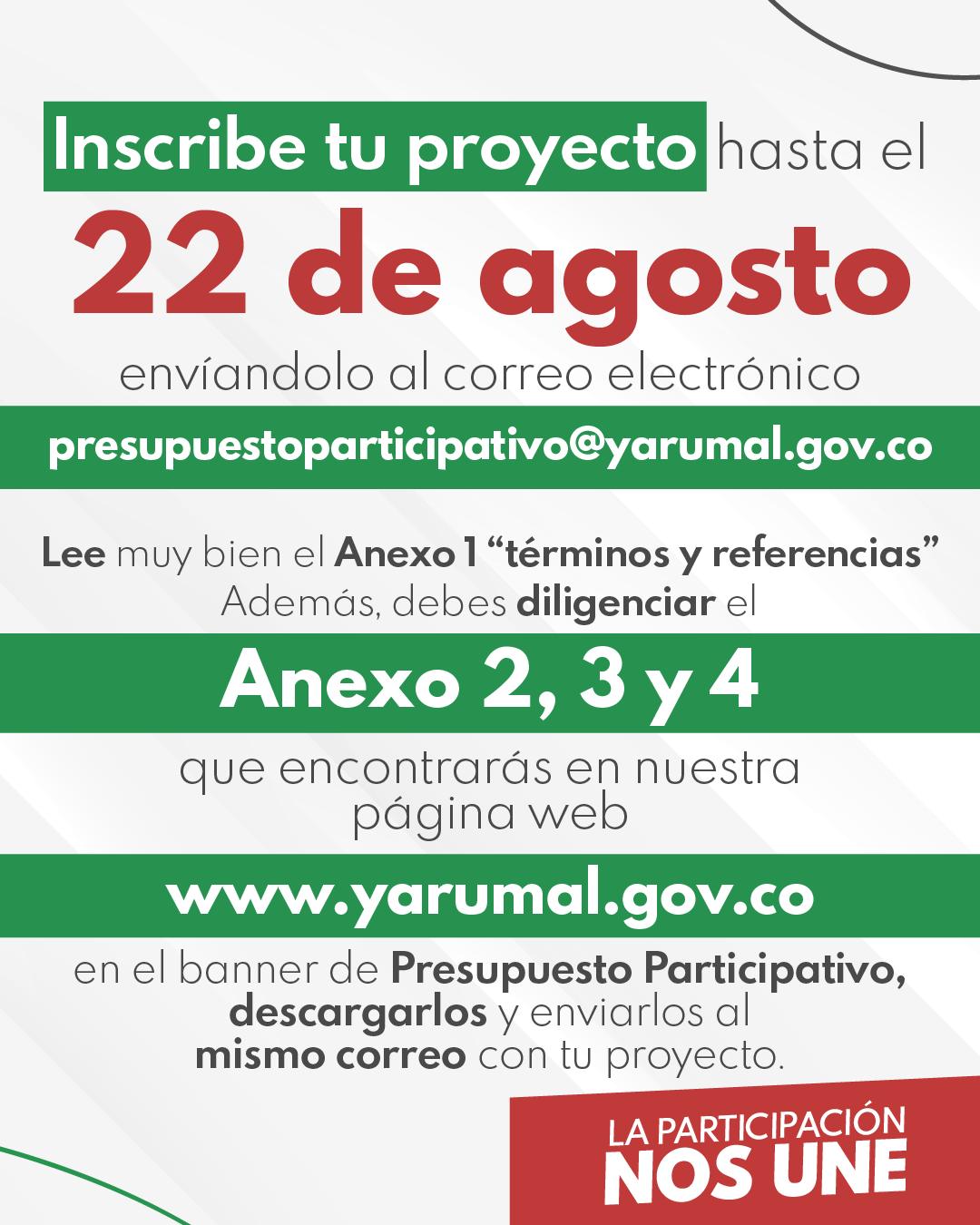 📍 Consulta los términos de referencia en la https://www.yarumal.gov.co/noticias/convocatoria-oficial-presupuesto-participativo-2025-yarumal-nos-une